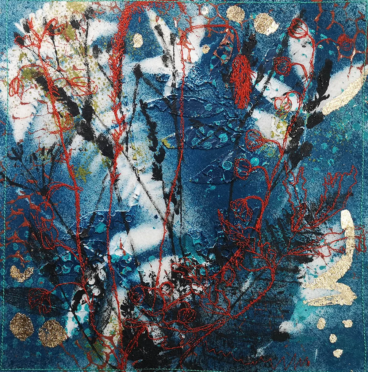 I have now completed the 12 month Flourish Course with Ellie Hipkin, which I have enjoyed very much. I love the way the course is structured, having a monthly project, with new techniques each month has been perfect for me. Not enough to feel overwhelmed but enough to build on when time permitted. My confidence with painting on fabric and free motion embroidery has grown, as well as other textile art techniques. The course had given me a strong foundation on which to develop my mixed media textile art in future.