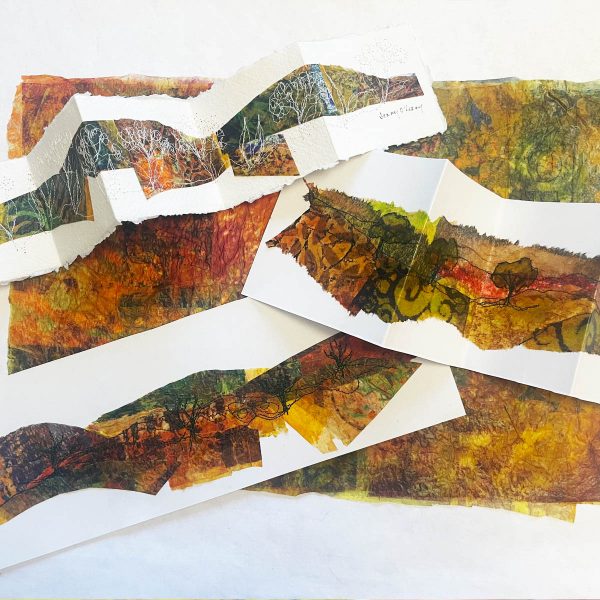 Join textile artist Jenny O’Leary as she guides you through the exciting process of creating panoramic landscapes using batik (hot wax resist) and mixed media collage. You’ll make your own unique papers through playful mark-making and layering, then collage and stitch them into expressive landscapes full of texture and depth.