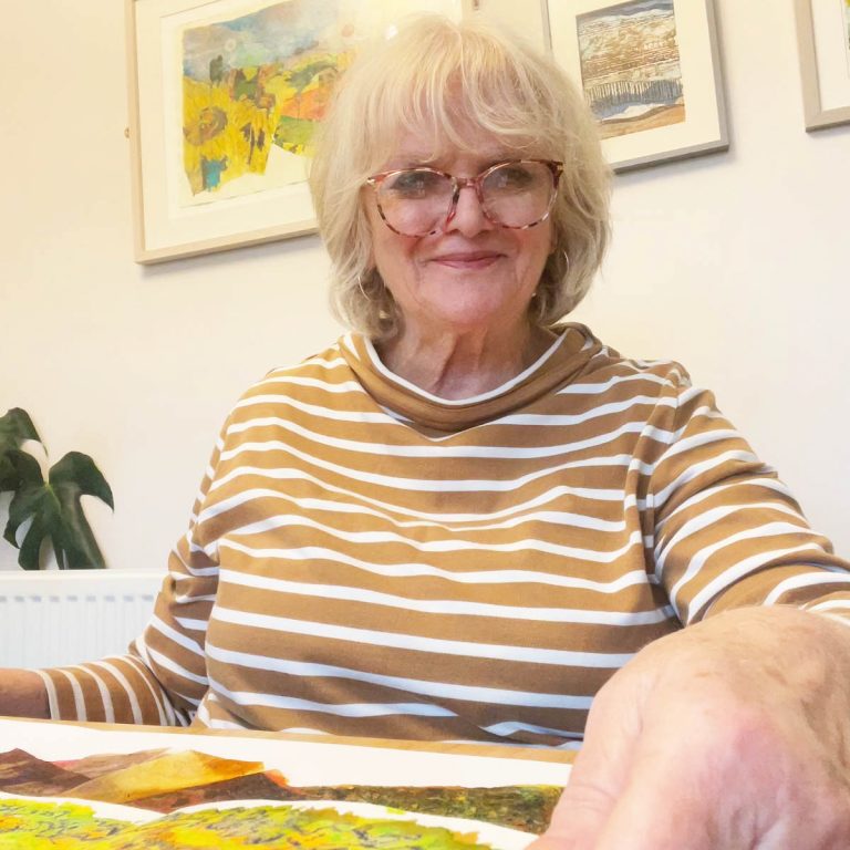 Jenny O’Leary is a textile artist and tutor based in Shropshire, inspired by the beautiful landscapes of Shropshire and the Welsh borders. Her work captures the feeling of place rather than a direct representation, using hot wax resist on tissue, paper, and fabric, often combined with machine embroidery to add a drawn element.